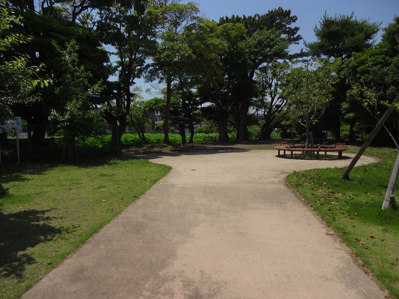 第2蓮池に続くサークルベンチのある小さい芝生広場。